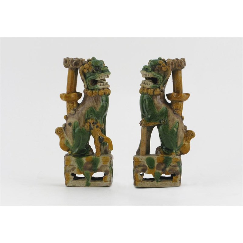 A pair of Chinese models of lion dogs, each enamelled on the biscuit in green, yellow and aubergine, Kangxi 1662-1722, restoration and losses, 15.5cm. (2)