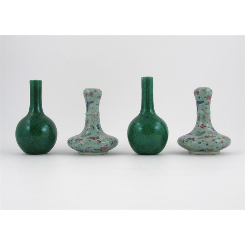 Four small Chinese green ground vases, two with a crackle glaze, the others painted with butterflies and flowers, 19th century, 13cm. (4)