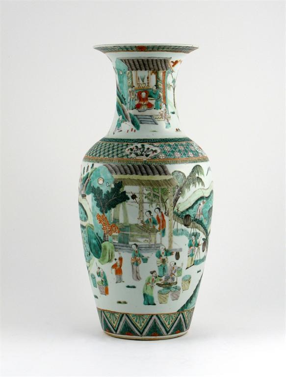 An unusual Chinese famille verte ovoid vase, painted with a continuous scene of figures engaged in the production of rice and silk, the base with a four character Qianlong mark, but 19th century, 56cm.