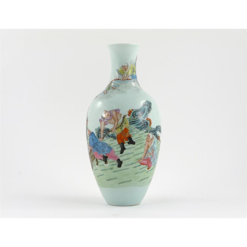 A Chinese famille rose ovoid vase, decorated with four figures, catching a tiger and scaly dragon in a landscape, the base with a blue enamel four character Qianlong mark, but 20th century, 25cm.