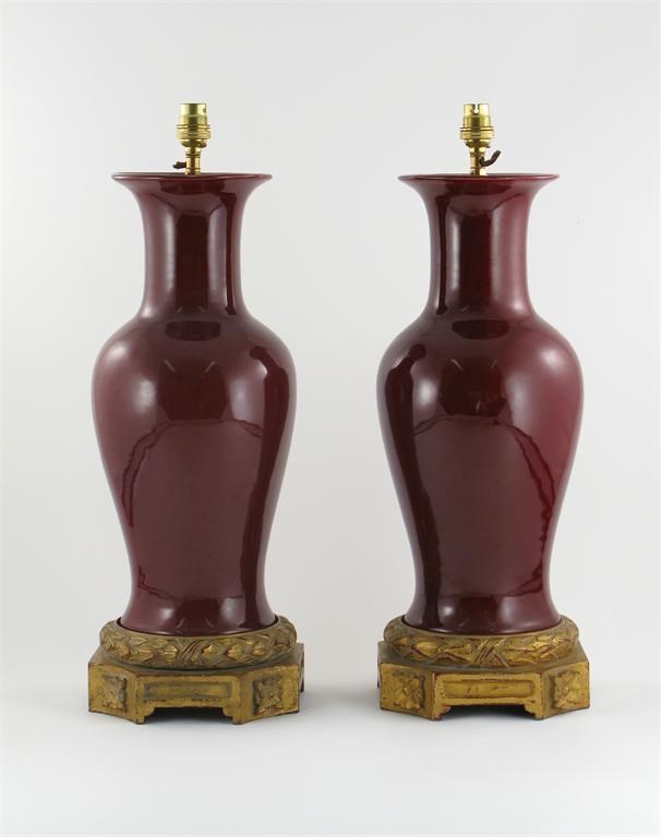 A pair of Chinese sang de boeuf glazed vases, mounted and fitted as table lamps, 20th century, 49cm overall. (2)
