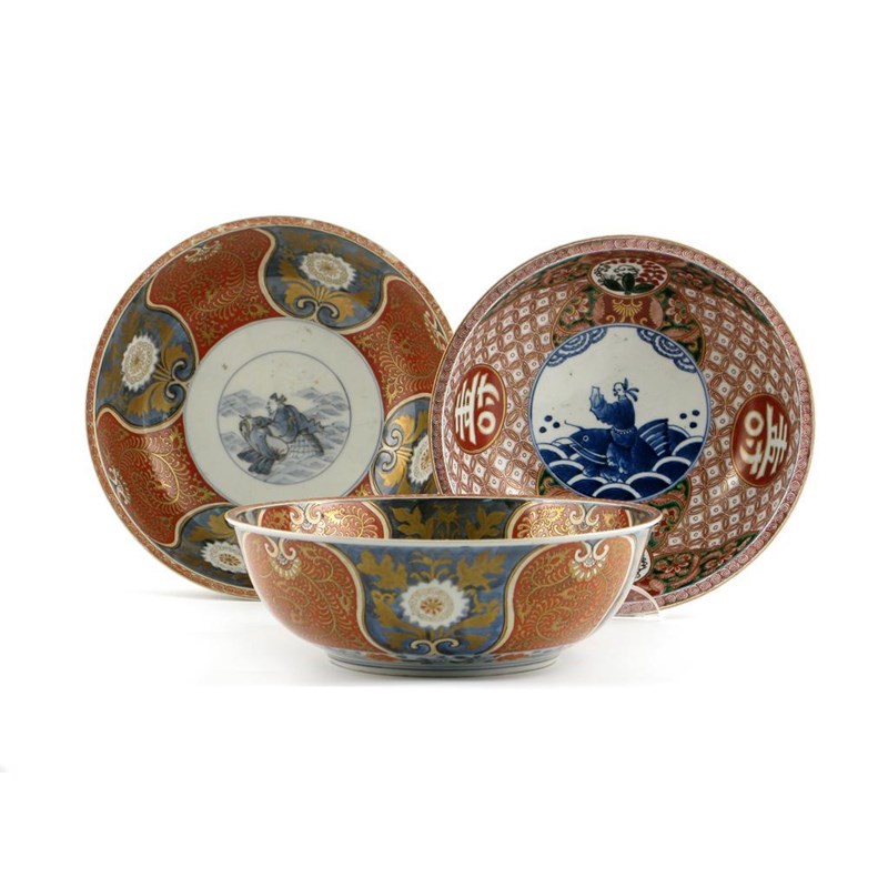 A pair of Japanese Kenjo Imari bowls, each painted with a figure riding a huge carp amidst waves, the borders with flowers and scrolling foliage, together with a similar bowl with a six character Chenghua mark, all 19th century, 25.7cm. (3)