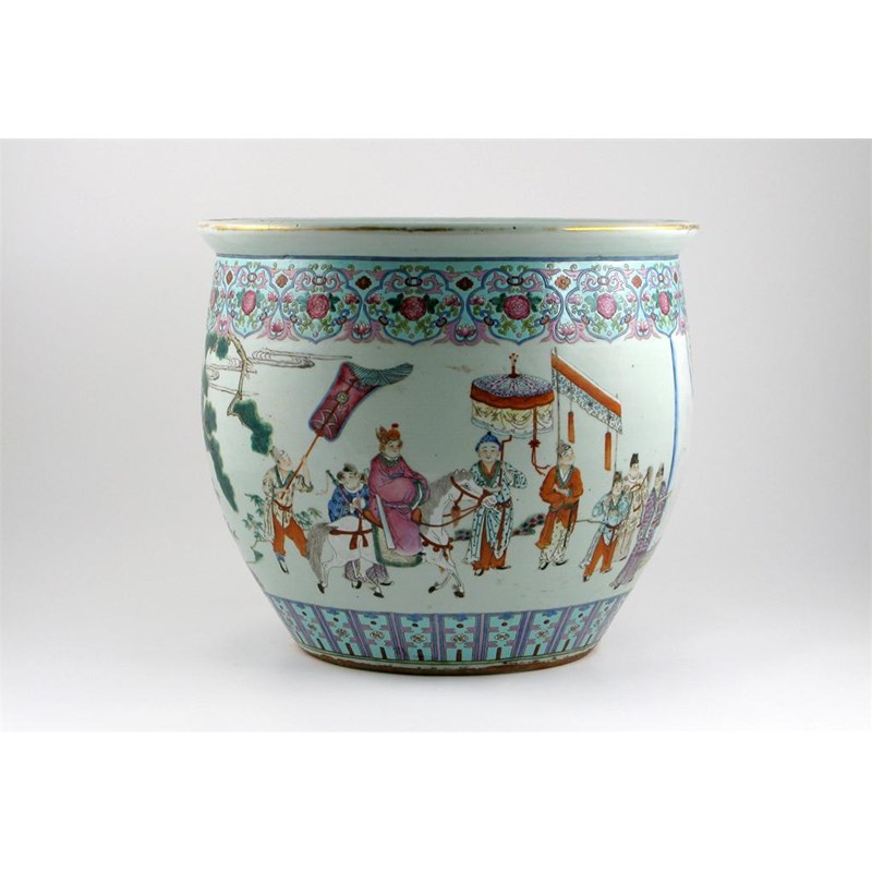 A large Chinese famille rose jardinière, painted with a procession and courtiers in a garden with rockwork and pine, beneath a border of chrysanthemum lappets, 19th century, a little wear to the gilding, 46.5cm diameter.