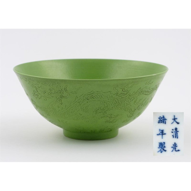 A Chinese green ground dragon bowl, the scaly creatures incised to the exterior, each in pursuit of a flaming pearl, the base with a six character Guangxu mark and perhaps of the period, 14.2cm.
