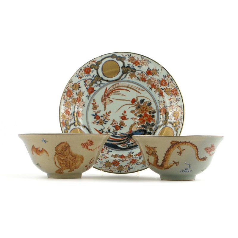 A pair of Chinese polychrome bowls, brightly enamelled with dragons, bats and auspicious objects on a grey brown celadon ground, each with a sketchily drawn Jiaqing seal mark and probably of the period, 18.5cm, together with a damaged Imari dish, 27cm. (3)