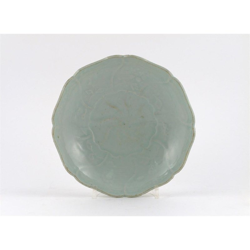A Chinese Qingbai mallow-shaped dish, moulded with a central spiral motif and with eight radiating panels containing differing flower sprays, Song/Yuan dynasty, 17cm.