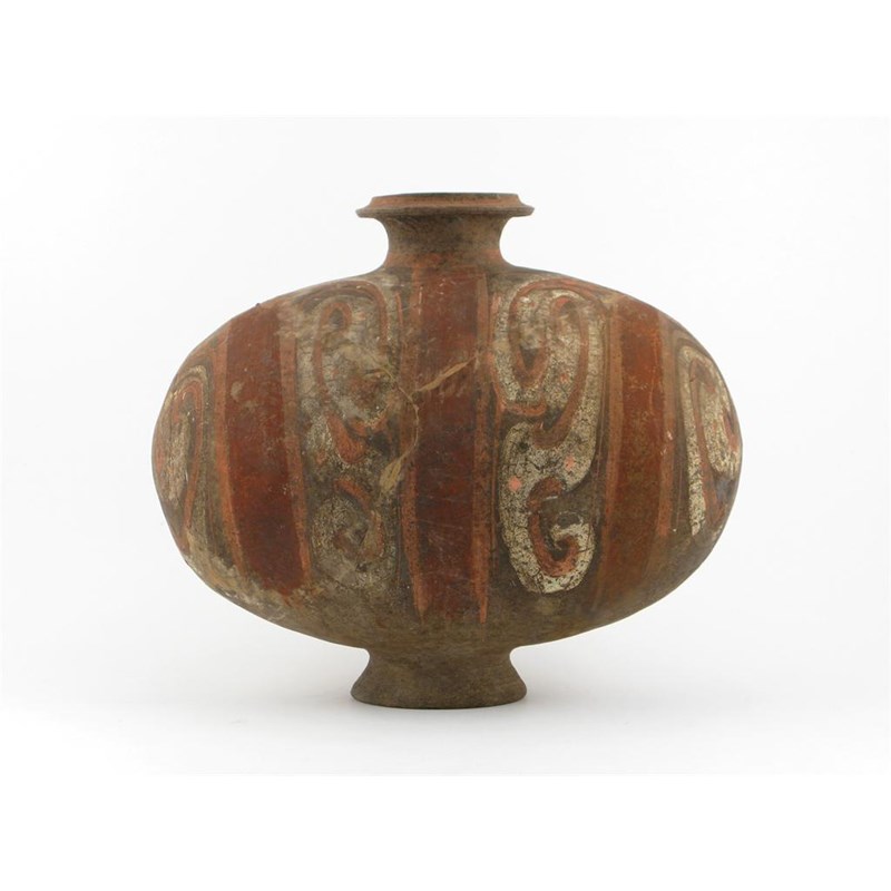 A Chinese pottery cocoon vase, typically decorated in earth pigments, with bands of scrolls, Han dynasty 206 BC - 220 AD, damaged and repaired, 31cm across.