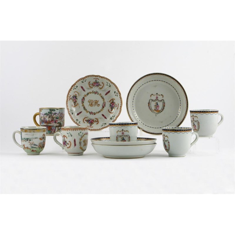 Six Chinese coffee cups, four armorial with matching saucers, one painted with a hunting scene and one with figures at leisure, all 18th century, minor damages. (10)