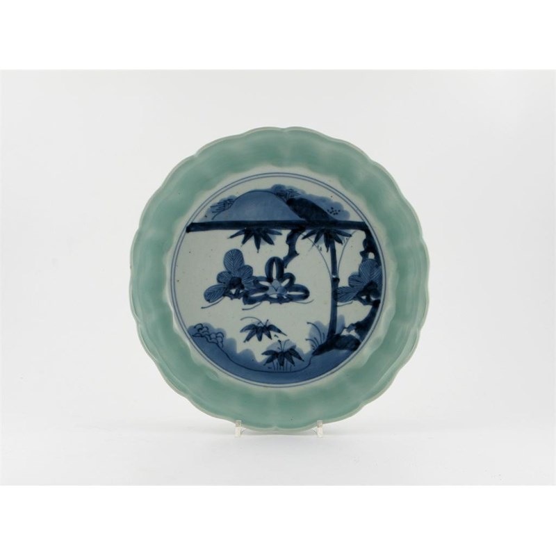 A Japanese Arita moulded dish, painted in blue with bamboo and pine within a wide celadon border, the base with a six character Chenghua mark, 18th century, 29cm.