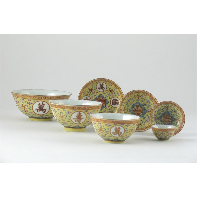 Four yellow ground medallion bowls, and three matching small dishes, of varying sizes, each with the four character commendation wan shou wu jiang in gilt in a circular cartouche, six character Guangxu marks, 13cm max. (7)