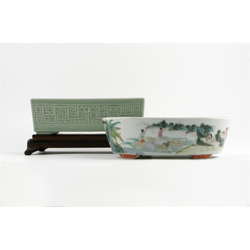 Two Chinese shallow jardinières, one painted in the famille rose palette with figures in a landscape, the other celadon moulded with taotie masks, both with six character Qianlong marks, 19th century, some damage, 23.5cm max. One with a wood stand. (3)