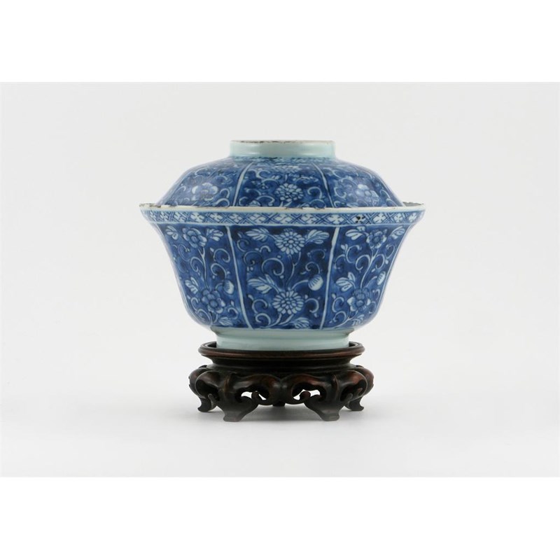 A Chinese blue and white bowl and cover, painted with panels containing flowers, Kangxi 1662-1722, the rims fritted, the stand damaged, 15.1cm. Together with a hardwood stand. (3)