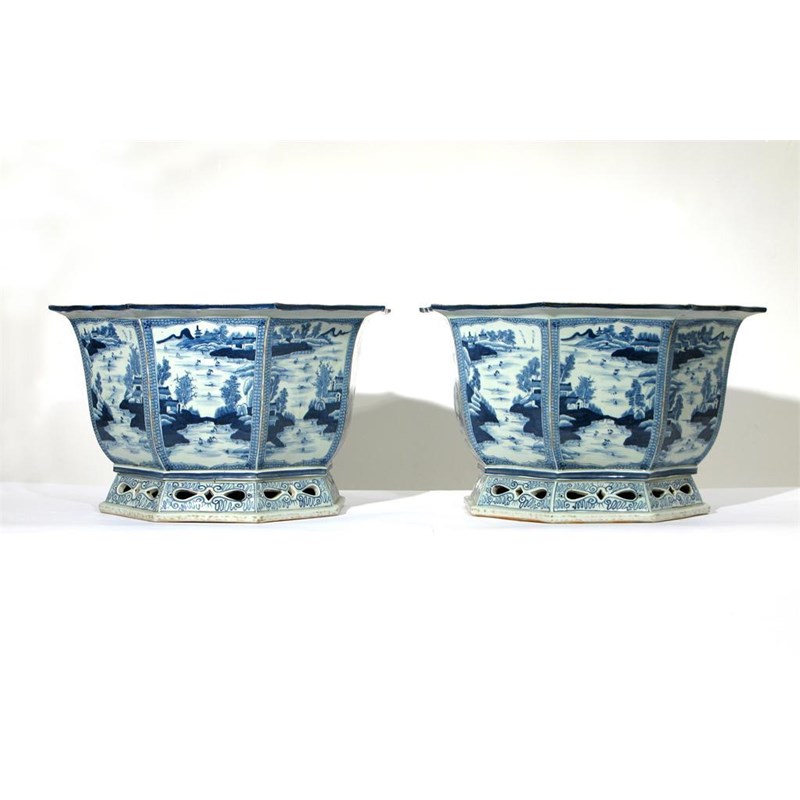 A large pair of Chinese blue and white octagonal section jardinières