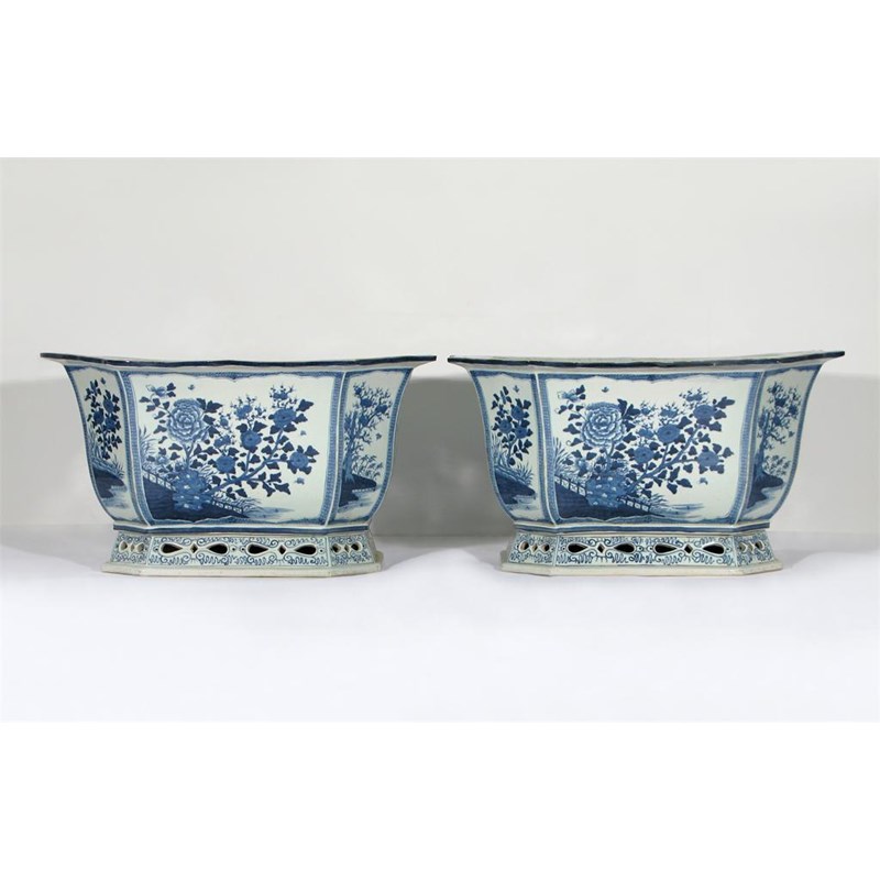 A large pair of Chinese blue and white rectangular jardinières