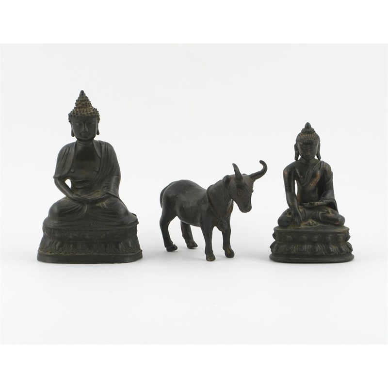 A small bronze model of a young billy goat, with a bell around his neck and two small bronze models of Buddha, 14.5cm. (3)