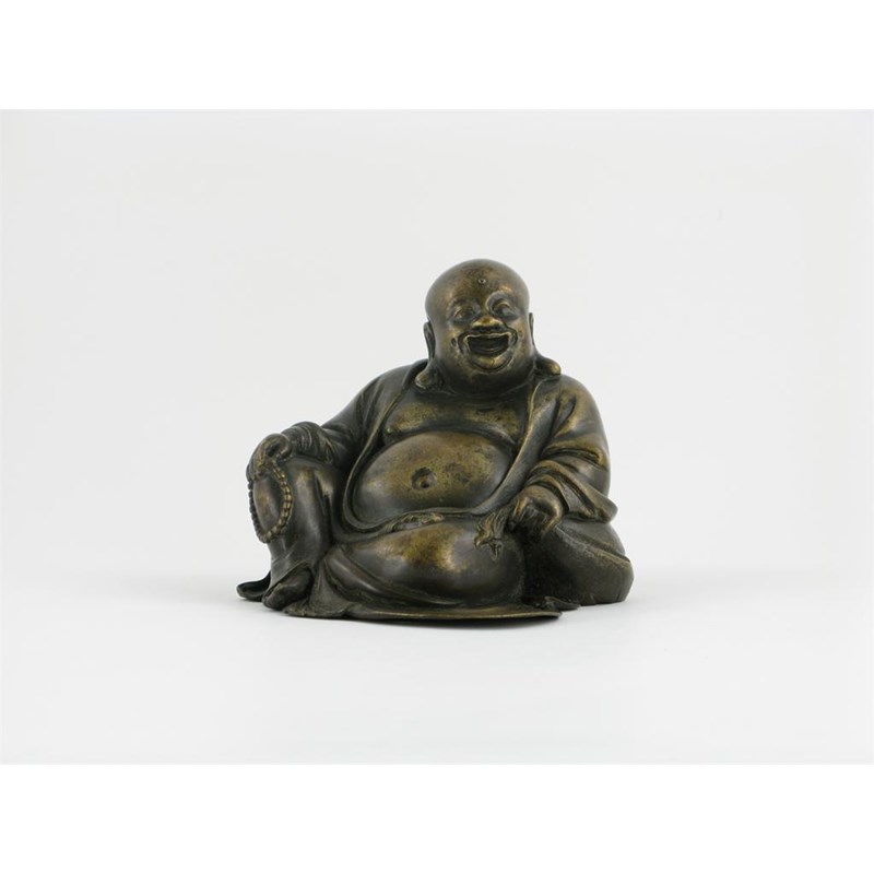 A Chinese bronze seated figure of Budai Ho Shang, holding the mouth of his hempen bag with his left hand, his right hand resting on his knee, 17th/18th century, some damages, 13.7cm.