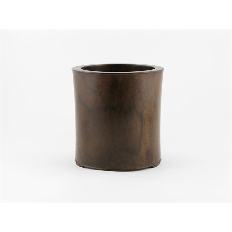 A Chinese hardwood brushpot, with a waisted cylindrical body raised on three feet, 19th/20th century, some chips, 19.5cm.