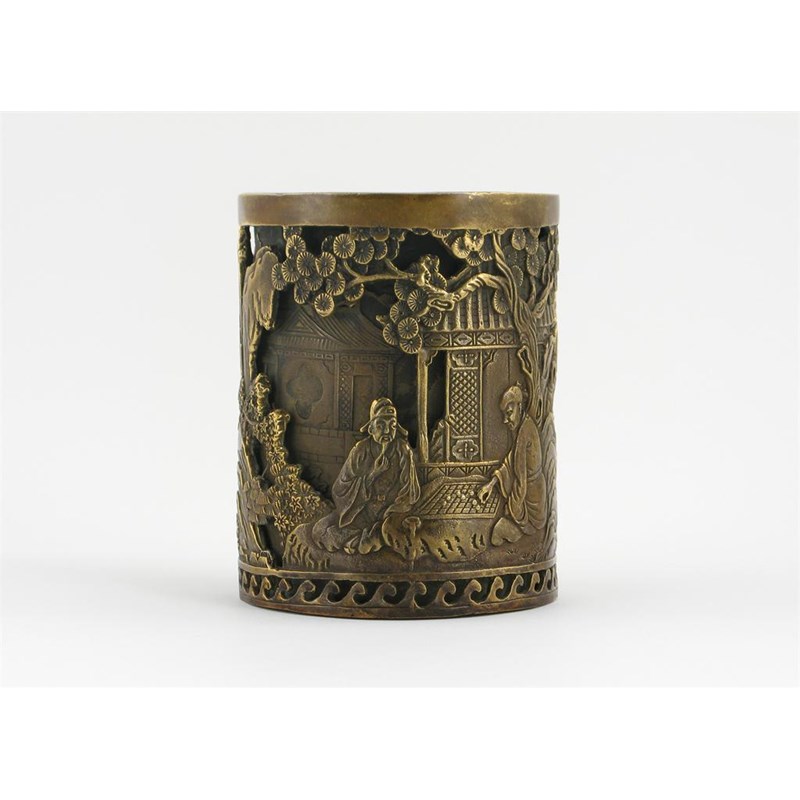 A Chinese bronze double-walled brushpot, decorated with four figures, two playing Go beneath a pine tree, the others walking in a mountainous landscape, the base with a sixteen character mark, 12.9cm.