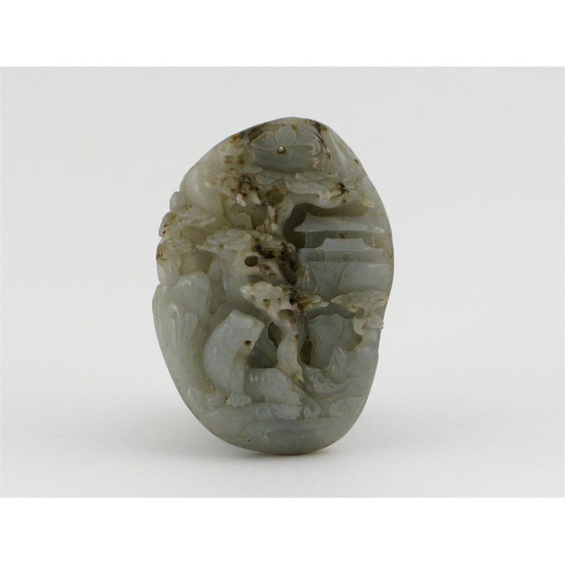 A Chinese celadon jade carving, one side carved with three deer and a bird amidst the Three Friends of Winter, the other with a ferocious tiger beneath a pine tree and a pagoda on a mountainside, the top pierced with two suspension holes, probably 19th century, 9.5cm.