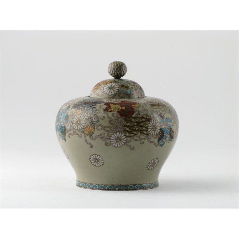 A small Japanese cloisonné ovoid vase and cover, decorated with a polychrome pattern of stylized foliage, sprawling tendrils and scattered flower heads over a pale sage green ground, c.1900, 10.2cm. (2)