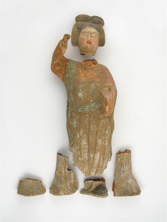 A large Chinese pottery model of a fat lady, gazing in a mirror, Tang dynasty 618-906 AD, extensively damaged, 53cm.