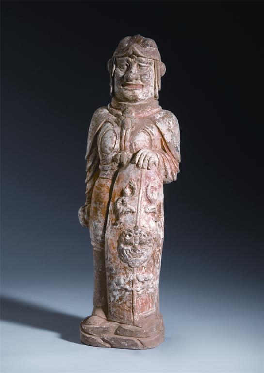 A Chinese pottery model of a soldier, standing erect and holding his shield, northern Qi dynasty 550-577 AD, 49cm.