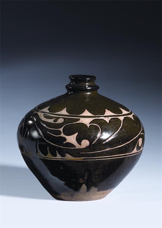 A Chinese olive-green glazed cizhou peony bottle, Jin dynasty 1115-1234 AD, 21cm.