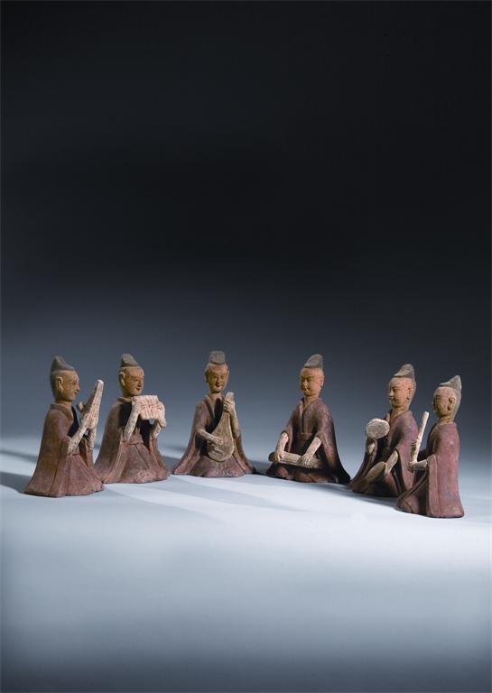A set of six Chinese unglazed and painted black pottery models of musicians