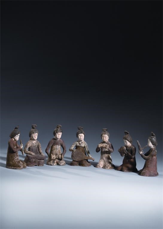 A set of seven Chinese unglazed and painted pottery models of seated female musicians