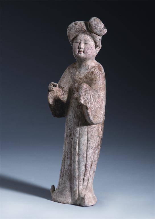 A Chinese small model of a court lady with raised arms and upturned feet, Tang dynasty 618-906 AD, 34cm.