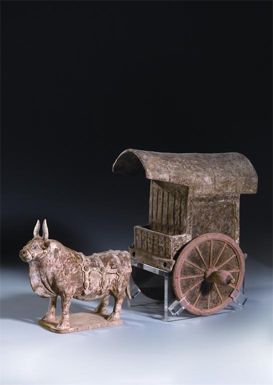 A Chinese unglazed pottery model of an ox and cart, Northern Qi dynasty 550-577 AD, 34cm. (2)