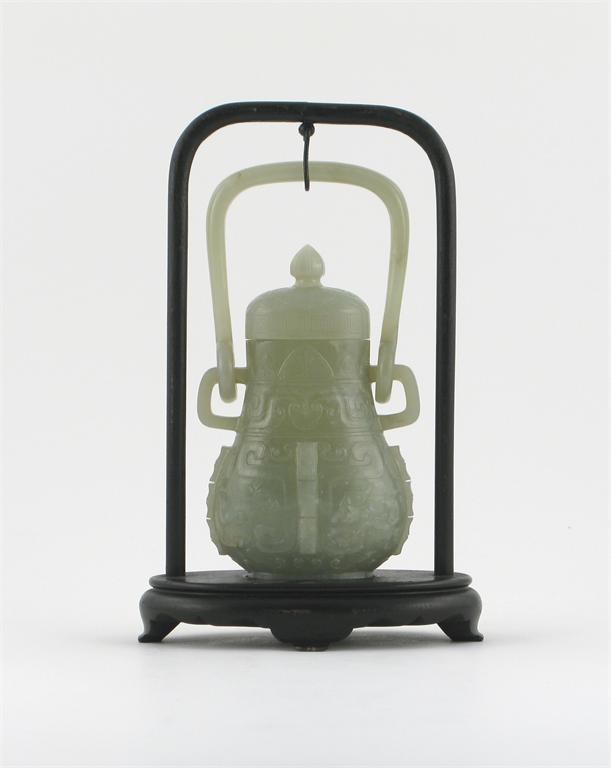 A good Chinese pale celadon jade two-handled hanging vase and cover, the body carved in relief in an archaistic bronze style with taotie masks, 18th/19th century, 16.2cm. Together with a modern wood stand. (3)