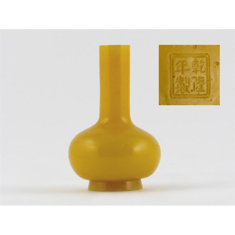 A Chinese yellow Beijing glass bottle vase, with a cylindrical neck and compressed circular body, thje base with a four character Qianlong mark and probably of the period, a tiny rim fleck, 13cm.