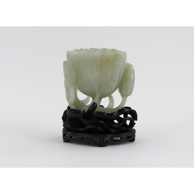 A Chinese pale celadon jade carving of a lotus pod, with an oval cover showing the seeds, the head supported by a central stem with leaves and two buds, all raised on an intricately carved wood stand inlaid in silver wire, 18th or 19th century, 7.5cm excluding the stand. (3)