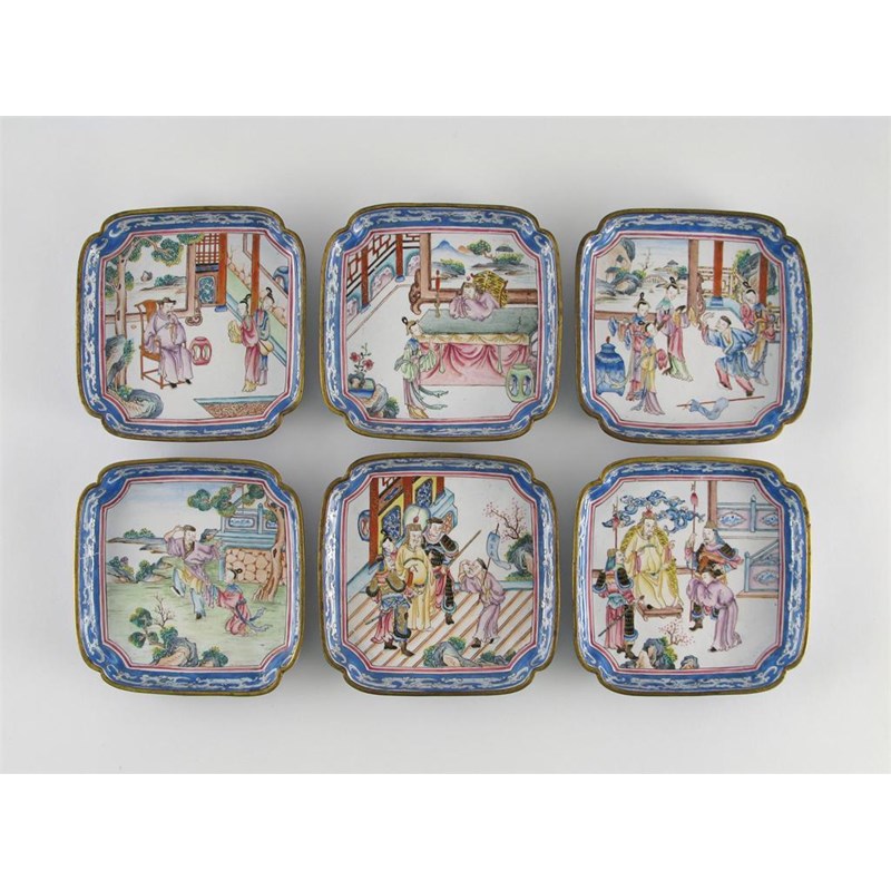 A set of six Chinese Canton enamel famille rose square dishes, with indented corners, depicting scenes of court life, with mythical dragon borders, the backs with crimson square marks, 18th century, small flaws to all dishes, 9.7cm. (6)
