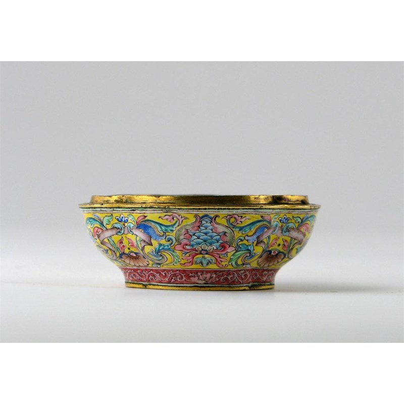 A rare Chinese Beijing enamel quatrefoil box base, finely painted with a design of pomegranates, shells, scrolls and ribbons on a yellow ground, above a rose border of leaf scrolls, gilded copper mounts to the rim and foot, 1st half 18th century, minor faults, 4.8cm.