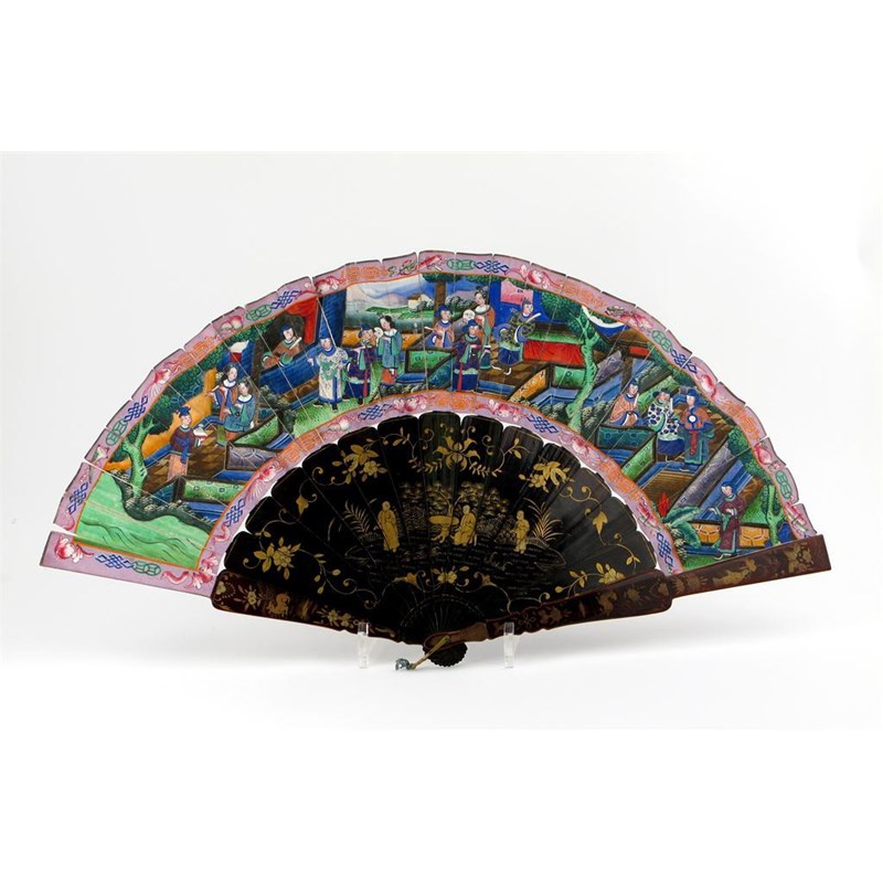 A Chinese fan, painted with figures at leisure, the sticks lacquered in gold with figures in a garden, 19th century, damaged.