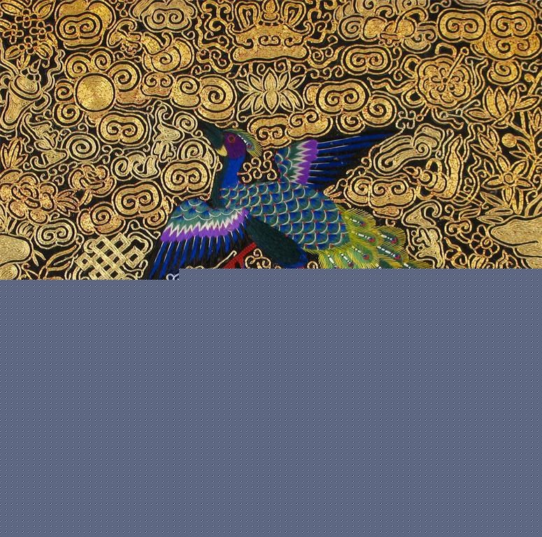 Two Chinese rank badges, each depicting a bird within an elaborate design of gold thread, 19th century, 30cm, contained in a black lacquer box. (3)