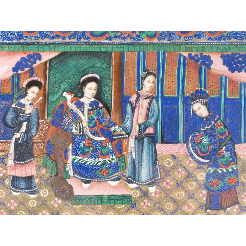 Four Chinese rice paper paintings, three depicting figures in interiors, the fourth of a pair of ducks, 19th century, some damages, 29cm. (4)