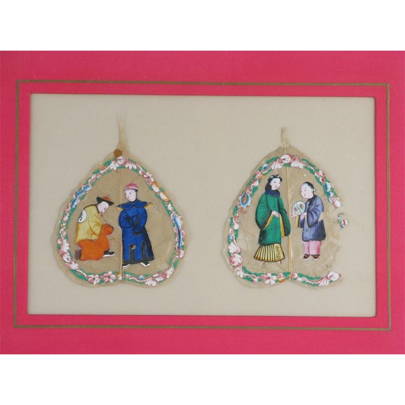 Two Chinese leaf skeletons, each painted with two figures within a floral border, 19th century, 14cm.