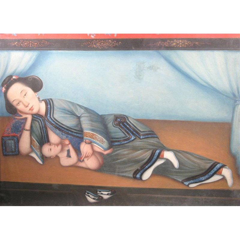 Chinese school 19th century, a nursing mother, reclining with her child, 58 x 78cm.