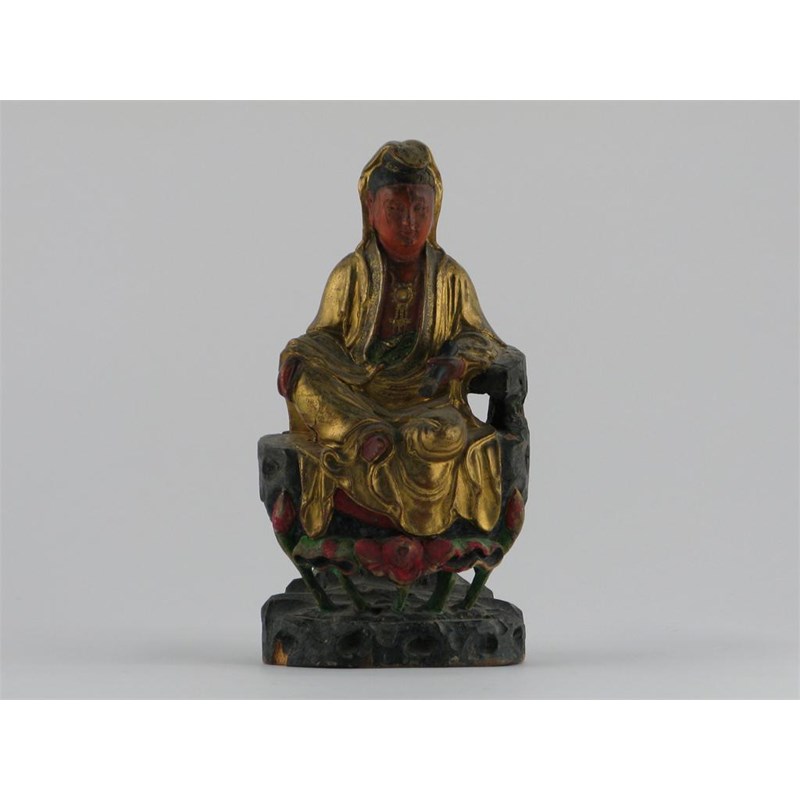 A Chinese gilt wood model of Guanyin, painted in polychrome, seated on a throne and holding a scroll, 19th century, damages, 23cm.