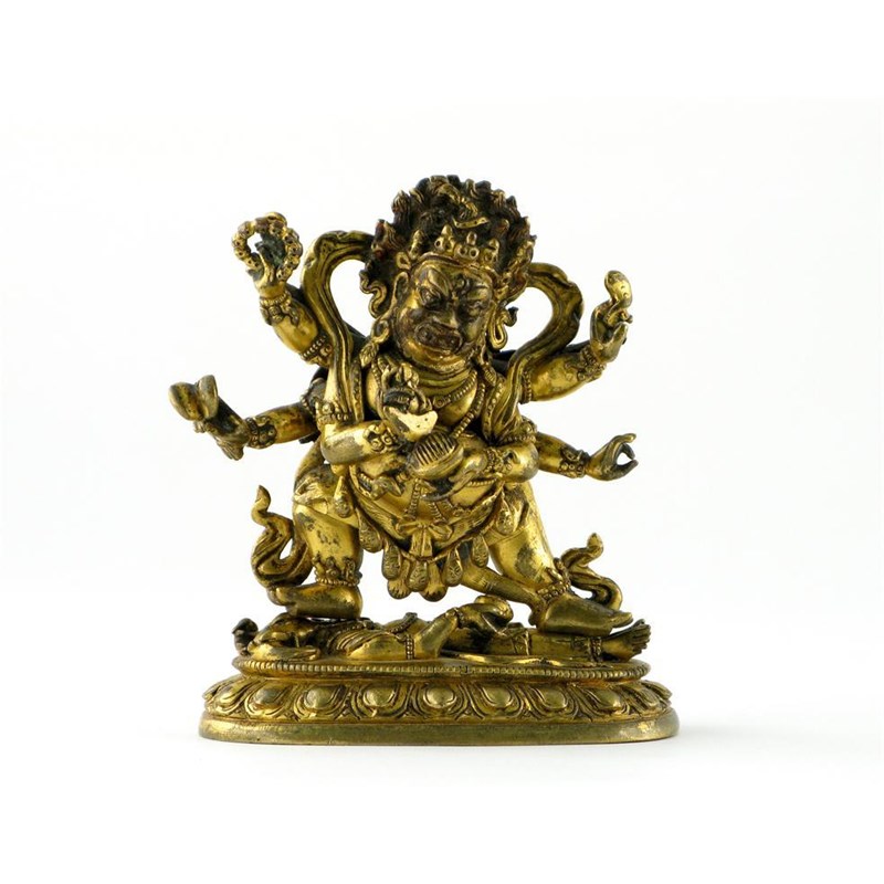 ** A Tibeto-Chinese gilt bronze figure of Mahakala, dancing on a prone elephant headed figure, he carries his attributes in his six arms, 18th century, the base detachable, 11.5cm. (2)