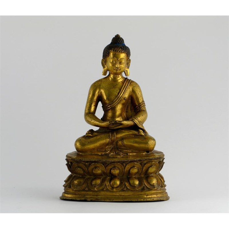 ** A Tibeto-Chinese gilt bronze figure of Buddha, seated in lalitasana mudra, his hands in dhyanamudra, seated on a lotus throne, 17th/18th century, some traces of blue pigment, his nimbus missing, 21.5cm.