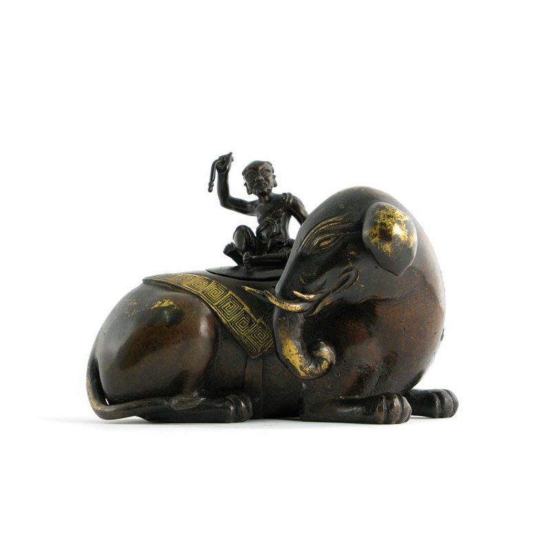 ** A Chinese gilt bronze incense burner, in the form of a recumbent elephant, his head turned to the right, a figure of an ascetic seated on the reticulated lid, 17th/18th century, slight wear, 23cm. (2)