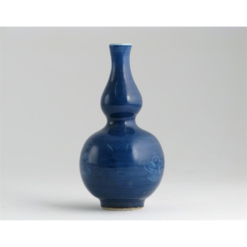 ** A Chinese double gourd vase, decorated with three lantern or shell motifs beneath a souffl? blue ground, Kangxi 1662-1722, some restoration to the neck, 12.5cm.