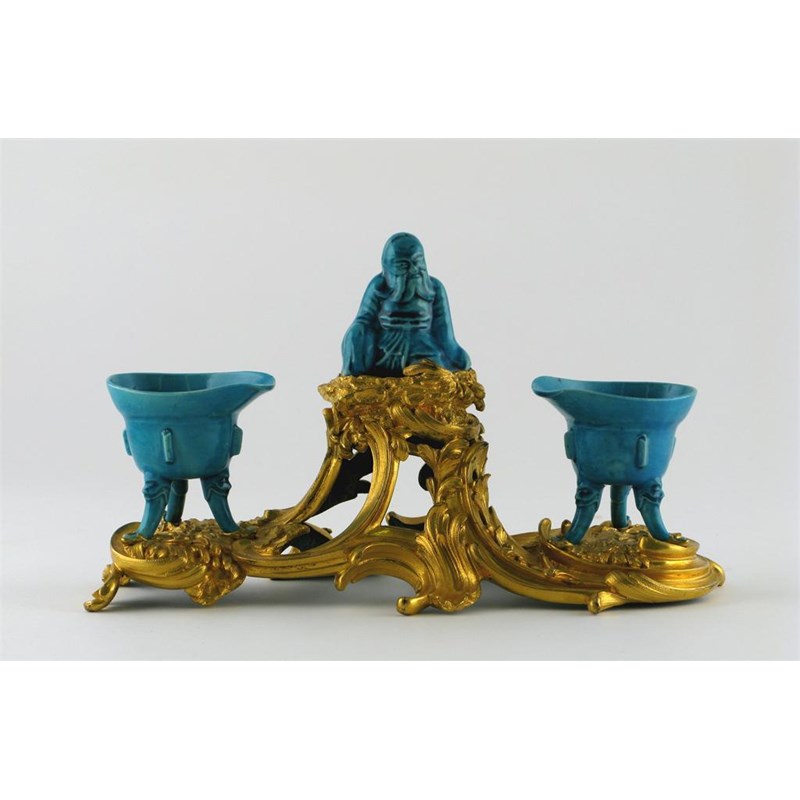 An ornate ormolu desk stand, mounted with two Chinese blue-glazed libation cups and a figure of a seated sage raised amidst lavish pierced rococo scrollwork, 18th/19th century, 30cm.