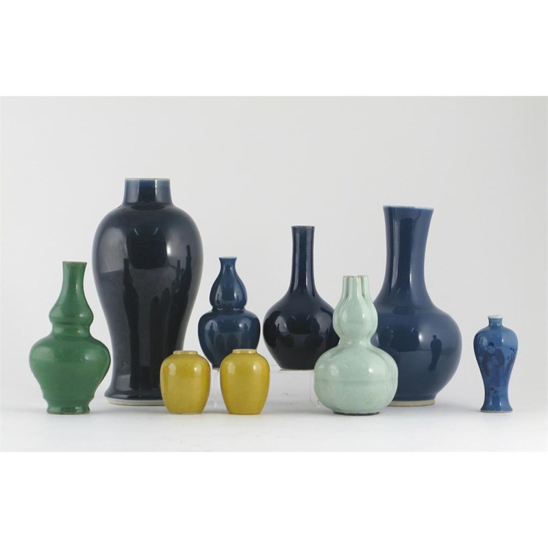 Nine Chinese porcelain vases, decorated with blue, green, yellow and celadon glazes, 18th century and later, minor damage, 23cm. (9)