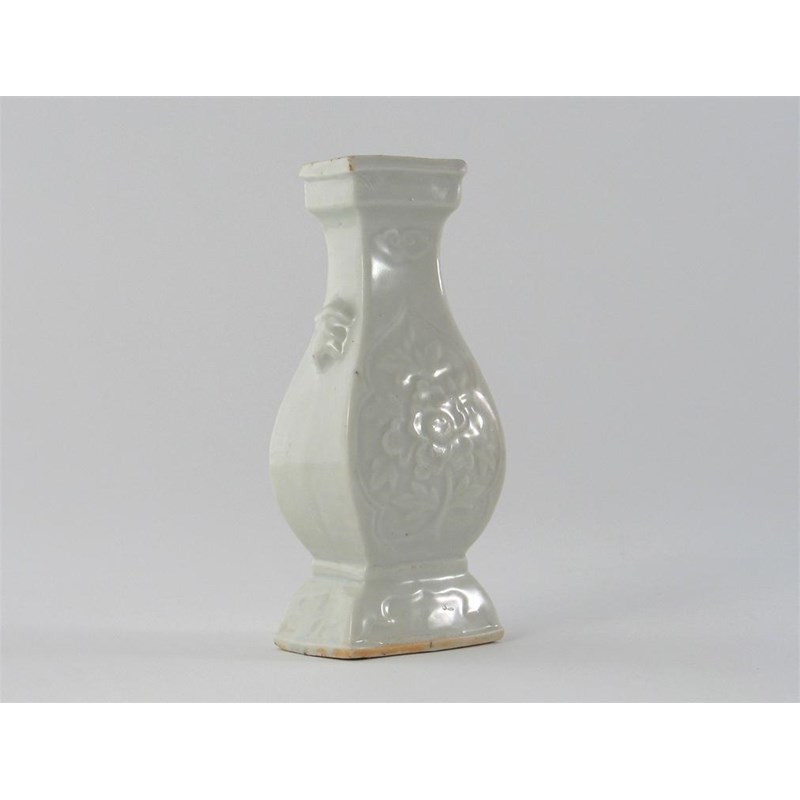A Chinese blanc de Chine small square section baluster vase, moulded with peony and animal mask handles, 18th century, 14.5cm.
