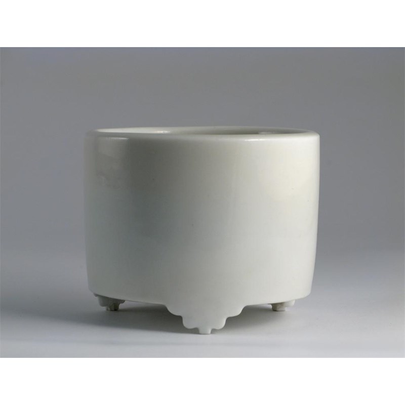 A Chinese blanc de Chine cylindrical tripod censer, raised on three bracket feet, the centre and base unglazed, Qianlong 1736-95, 9cm. Cf. P.J. Donnelly, pl.19B for a similar example.